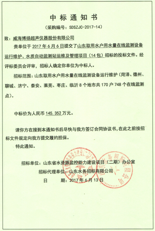 威海博揚(yáng)電子科技有限公司在2017年成功中標(biāo)山東省水資源監(jiān)控建設(shè)項(xiàng)目和山東省水資源運(yùn)維管理項(xiàng)目。出色的完成了上述項(xiàng)目,并獲得領(lǐng)導(dǎo)一致好評(píng)。