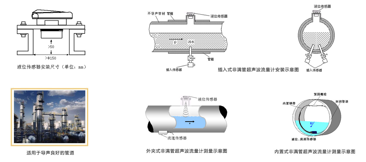 ? 流速測(cè)量采用外夾式、插入式和內(nèi)置式三種安裝方式。適用于市政污水、工廠(chǎng)污水等封閉管道。液位傳感器為管道頂部安裝或內(nèi)置式安裝。